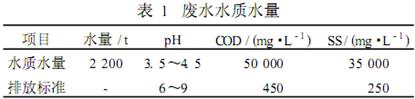 該企業(yè)廢水主要來(lái)自于粗餾塔酒糟廢水、精餾塔余餾水等廢水,廢水水質(zhì)和水量如表1所示。設(shè)計(jì)出水水質(zhì)須達(dá)到當(dāng)?shù)爻鞘形鬯幚韽S接管標(biāo)準(zhǔn)。
